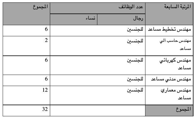 وقد بلغ إجمالي عدد الوظائف المشمولة بهذا الإعلان (32 وظيفة "هندسية") شاغرة (رجال، نساء)