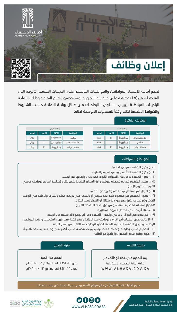 تدعو أمانة الاحساء المواطنين والمواطنات الحاصلين على الدرجات العلمية الثانوية الى التقدم لشغل (18) وظيفة على فئة بند الأجور والمستخدمين بنظام التعاقد وذلك بالأمانة للبلديات المرتبطة (يبرين – سلوى – البطحاء) من خلال بوابة الأمانة حسب الشروط والضوابط المنظمة لذلك